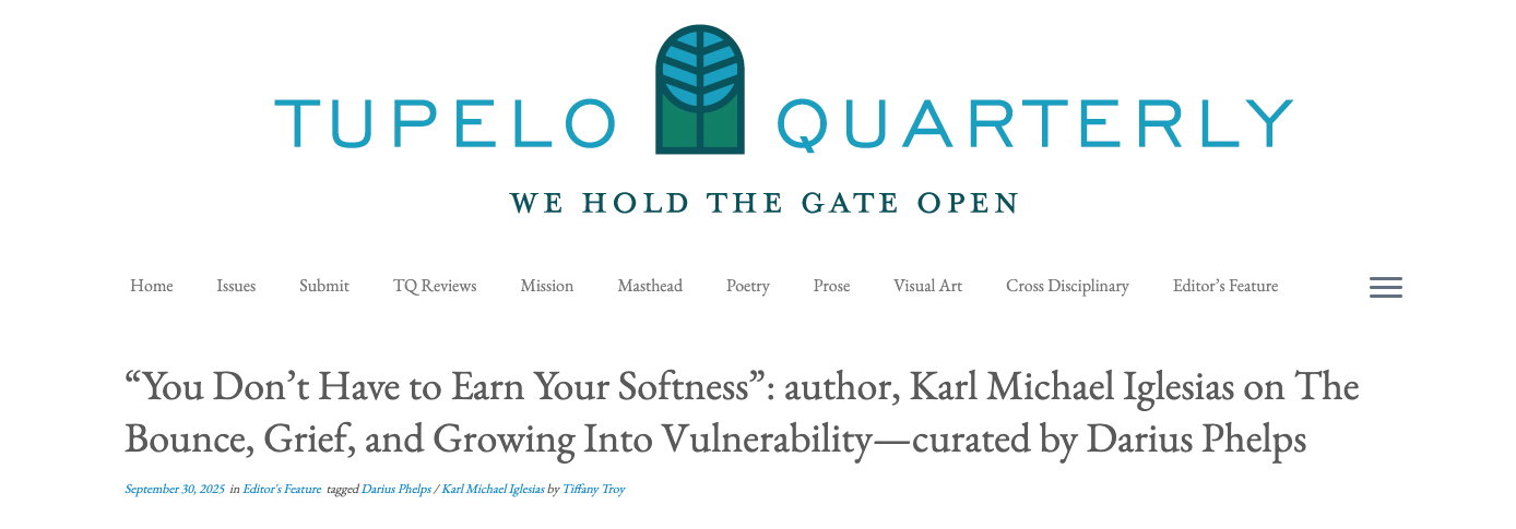 “In Karl Michael Iglesias’ excellent new book THE BOUNCE, the past and future are in constant conversation, as the poet tackles grief, penance, and the entanglements and redemptions of family and lineage. Tender parts still good, Iglesias writes, Some glass breaks so/small it needs/to be swept. THE BOUNCE is steadfast in its willingness to sit with the small, aching parts of the self. A truly gorgeous chapbook on the ways we show up for one another, in all the ferocious, overflowing costumes of love.”